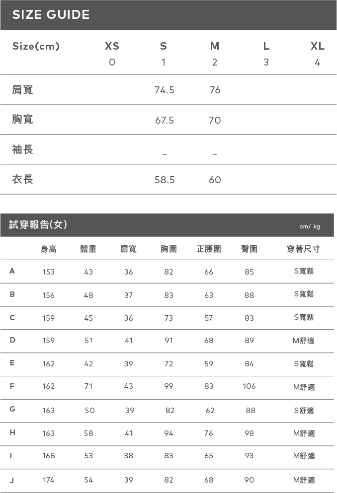 身高 168 肩寬:40 胸圍:76