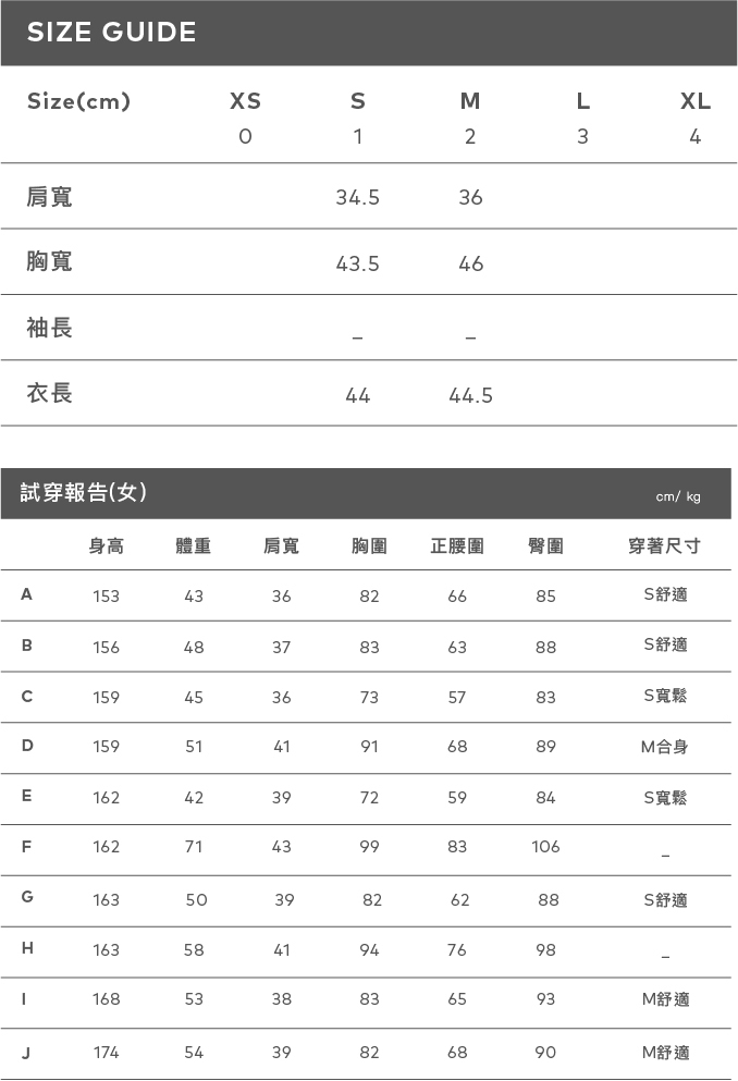 身高 168 肩寬:40 胸圍:76